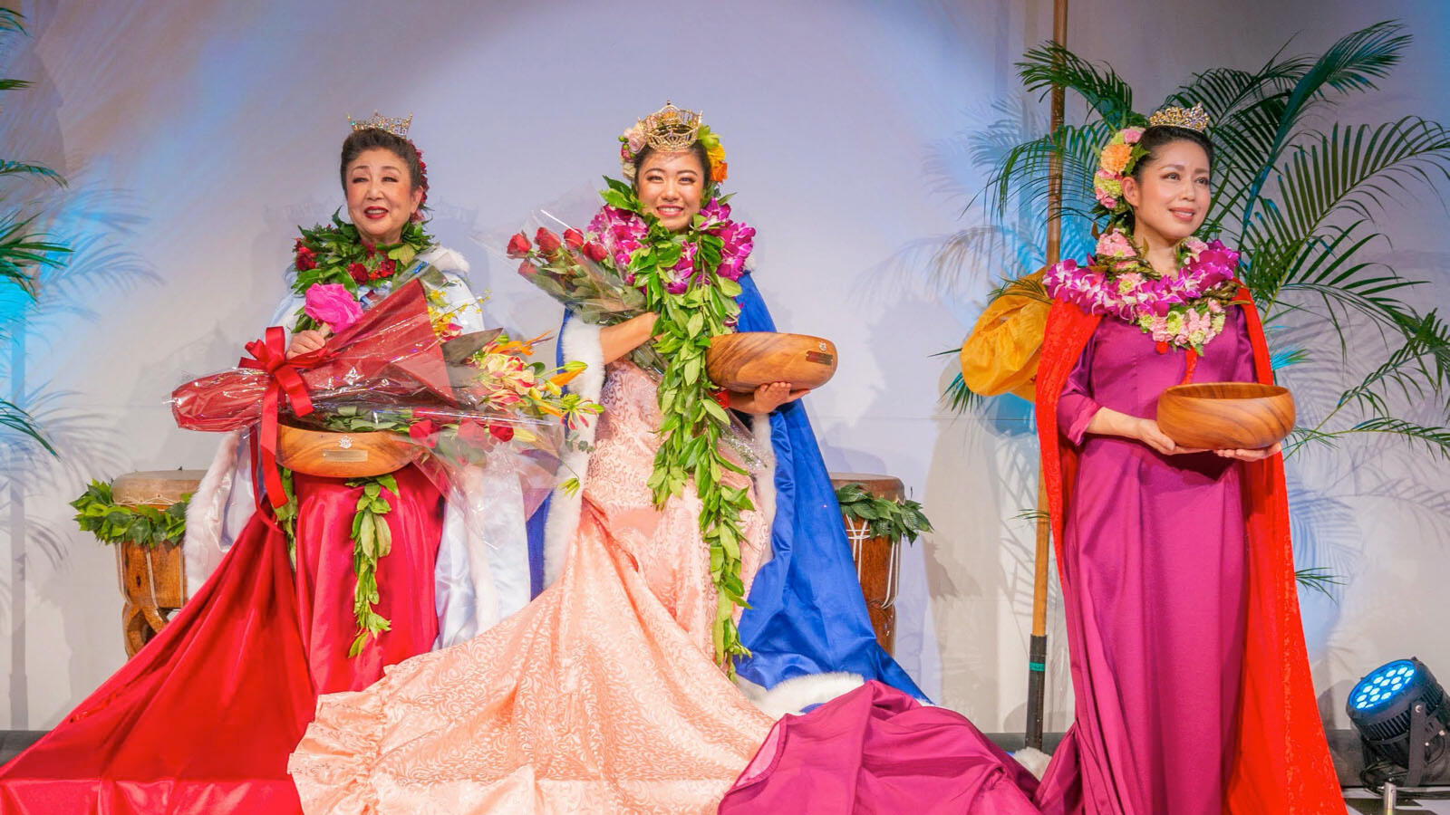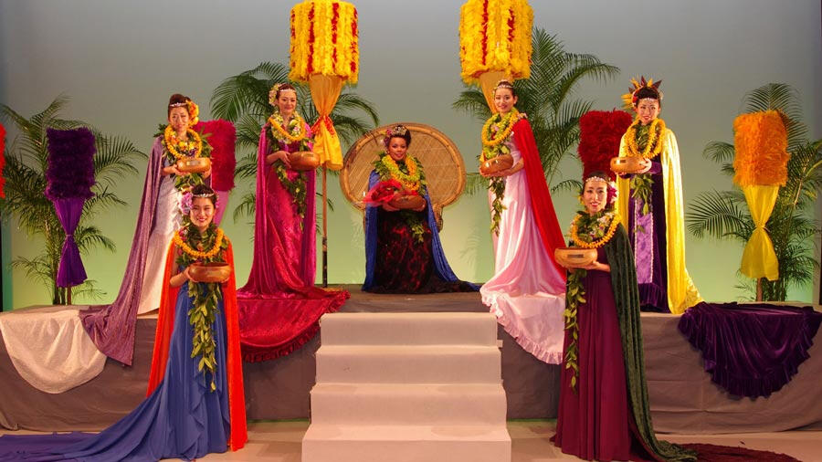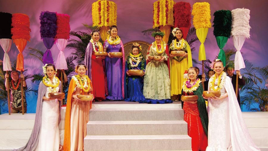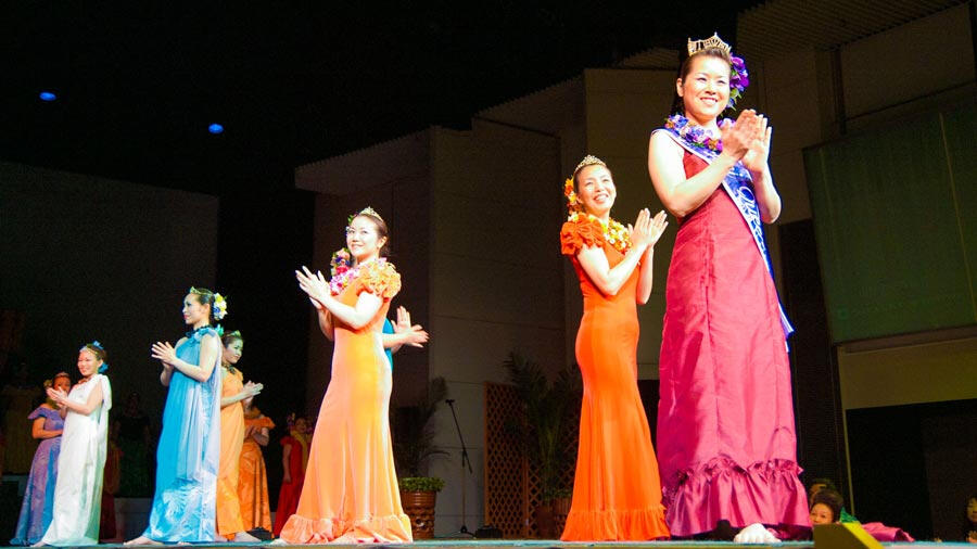 「レイ・ヒヴァヒヴァ(ヴィリ式のレイ作り)」と「クーカマッイリョ(インタビュー)」は前日に審査され、ステージ上のプログラムでは残りの4カテゴリーの公開審査が行われます。すべてのカテゴリーで満点を獲得した場合、最高で15,000ポイント(5,000×ジャッジ3名)を獲得することができます。総合得点の高いコンテスタントから